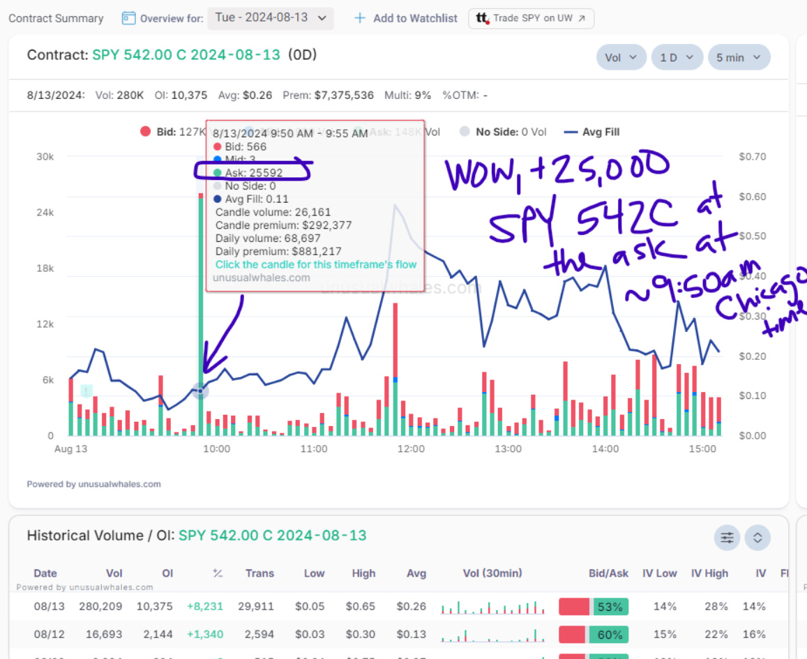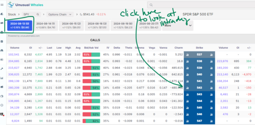For further inspection, we jump over to the options chains page for $SPY to examine the 0DTE $542 call contract that expired on August 13th. Selecting the bars next to the strike, we can view the intraday data for the strike.